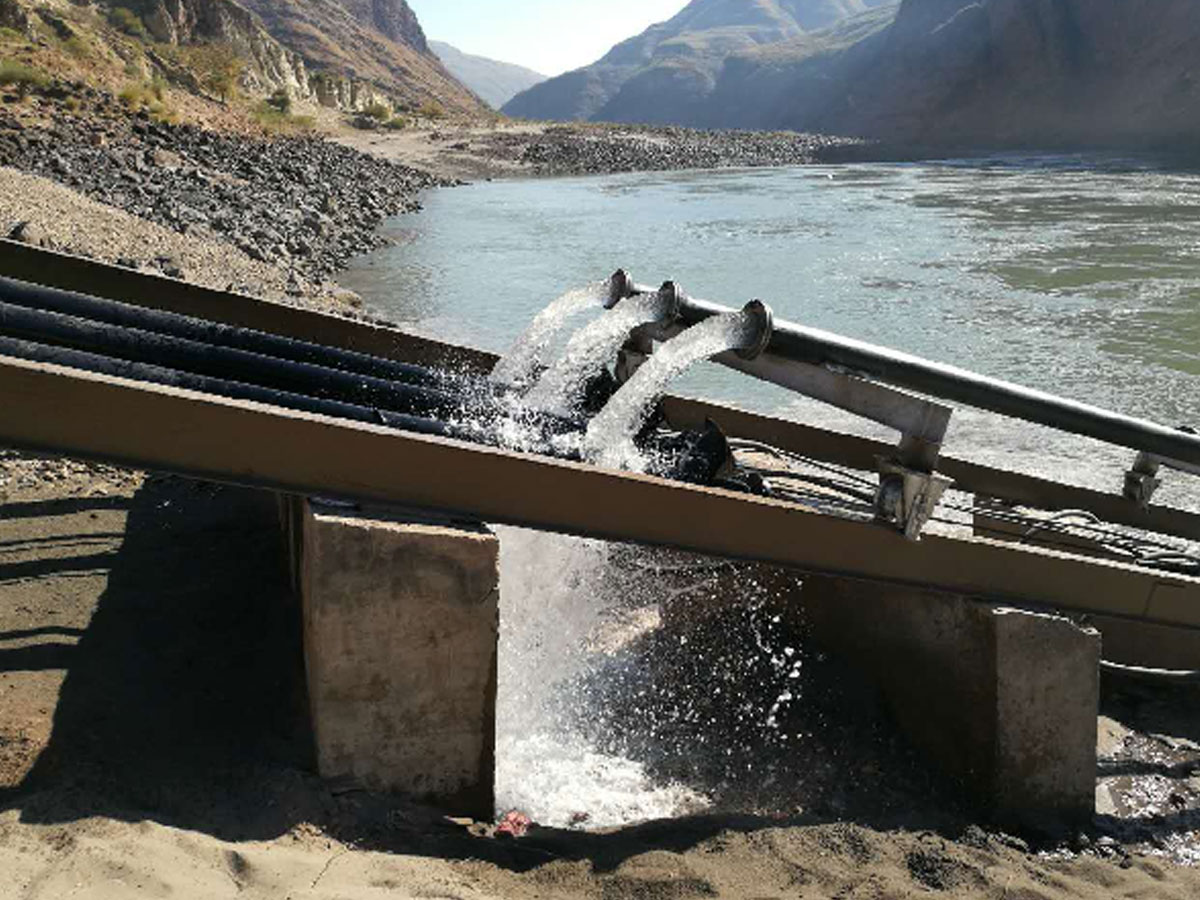 总净扬程1067m,管距9700m,主管道DN250,满负荷流量240m3/h,标准晴天日提水1300m3。